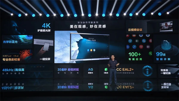 在本次發布的新產品華為協作平板,旨在讓更多的會議室,享有智能化的工作方式,讓更多的教室,享受到高效而且健康的互動教學體驗。新產品融合了柔光護眼、華為變屏,智繪妙筆等一系列黑科技,集合海量專屬大屏應用,端云協同,加速企業辦公的智能升級。